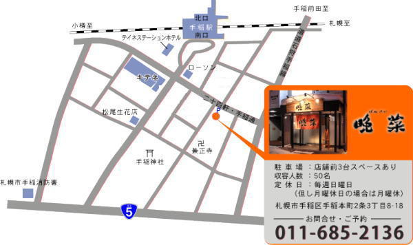 JR手稲駅南口を出て、手稲駅前通・二十四軒手稲通を南東へ徒歩約3分。